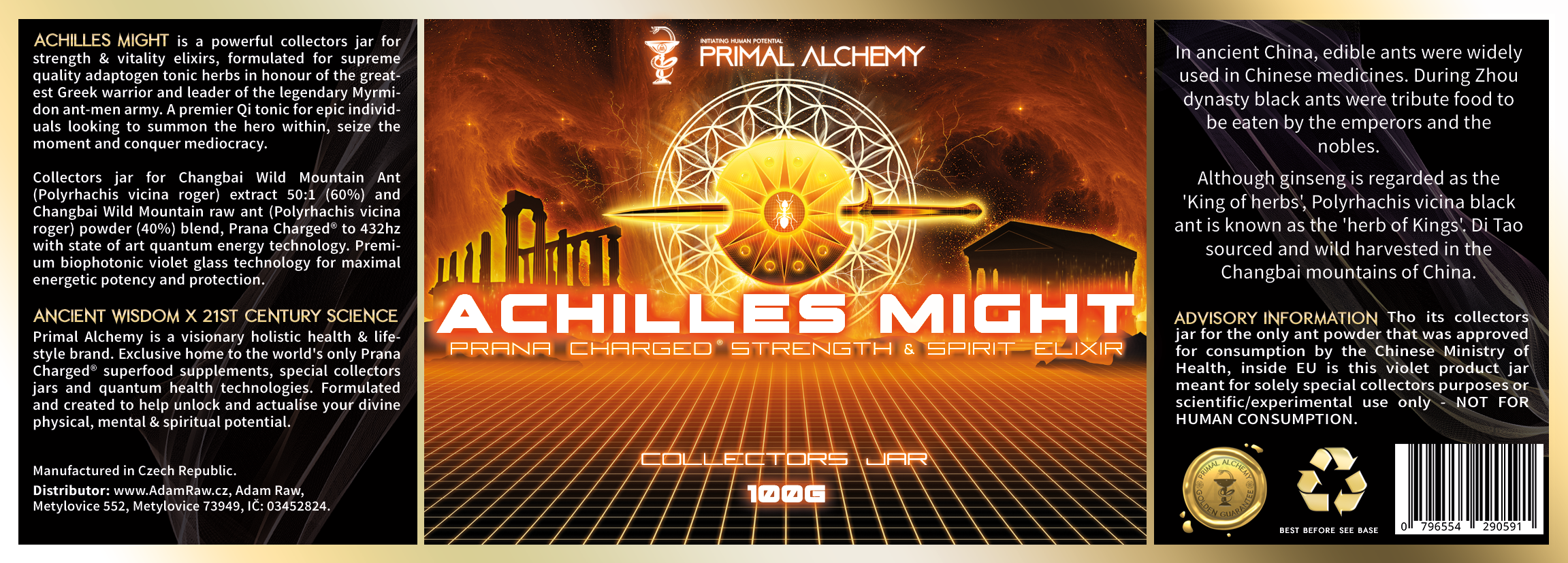 Dalo by se bohatě pokračovat v rozepisování a polemice různých legend a dalších částí řecké mytologie a proplétání příběhů spojováním dalších a dalších bodů skládačky (můžete sami hledat v relevantních zdrojích), nicméně dle výše uvedeného ve zkratce již každý jistě rozumí, proč sběratelská nádoba na adaptogenní elixíry síly a vitality z černých horských mravenců (polyrhachis vicina roger AKA "černý ženšen") od Primal Alchemy obdržel právě název Achilles Might (Achilleova síla) a vychází z těchto mýtů. Osobně jsem produkt navrhl, dohledal spojitosti řecké mytologie s myrmidony, mravenci, Diem a Achillesem a jako majitel Primal Alchemy otestoval. Věřím, že se jedná o jeden z nejdůmyslnějších 100% přírodních adaptogenů na trhu od A až do Z. Lehkým snížením koncentrace nejsilnějšího extraktu 50:1 (který produkt však obsahuje!) "zředěním" s celistvým raw práškem polyrhachis vicina roger jsem rovněž navrhl já, jednoduše proto, že samostatný 50:1 extrakt, je až extrémně potentní (a dost agresivní/silný) a věřím, že vlastnosti celistvého prášku jsou něžnější, vyváženější a synergičtější ve vztahu k celistvé potravině, ze které vznikl - společně pak vytváří harmoničtější a více vybalancovaný nástroj síly a vitality a navíc i za rozumnější cenu.