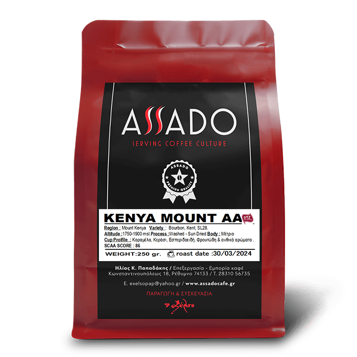 Single Origin Assado Kenya Mount AA (250 g) Karamelové, třešňové, citrusové, ovocné a květinové aroma. Původ: Mount Kenya , Odrůda: Bourbon, Kent, SL28 , Nadmořská výška: 750–1900 m n. m. , Zpracování: Prané, Sušené na slunci , Tělo: Střední