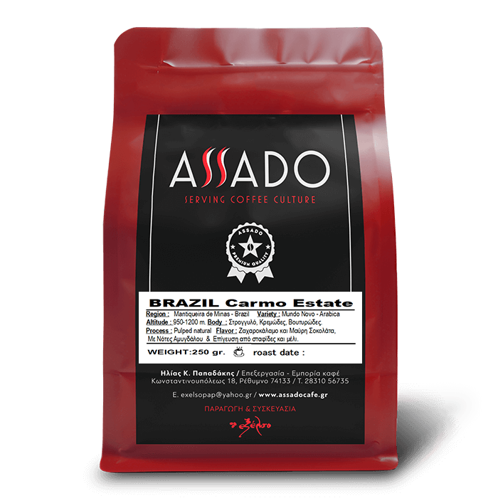 Single Origin Assado Brasil Carmo Estate (250 gr) Karamelová sladkost, tóny mandlí, cukrové třtiny a hořké čokolády, rozinky a med. Farma se nachází nedaleko města Heliodora v jižním státě Minas Gerais, v úžasné oblasti s hornatou krajinou a ideálními podmínkami pro pěstování speciálních káv. Původ: MANTIQUEIRA DE MINAS – BRAZIL , Odrůda: Mundo Novo – Arabica , Nadmořská výška: 950-1200 m. , Zpracování: Pulped Natural , Tělo: Velmi kulaté, Krémové, Máslové