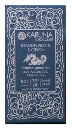 Karuna Peru 72% hořká čokoláda s dračími perlami (jasmínový zelený čaj) a kandovaným citronem v sobě spojuje bohatou peruánskou hořkou čokoládu s aromatickým zeleným čajem a jasnými citrusovými tóny. Hloubku kakaa doplňuje jemná hořkost čaje a svěží, povznášející citrusový závěr, což vytváří vrstevnatý a vyvážený profil. Ideální pro pomalé ochutnávání nebo k čaji a nápojům po večeři a nabízí rafinovaný, smyslově řízený čokoládový zážitek. Výrazná tyčinka pro ty, kteří oceňují jemné chutě a promyšlené párování ingrediencí.