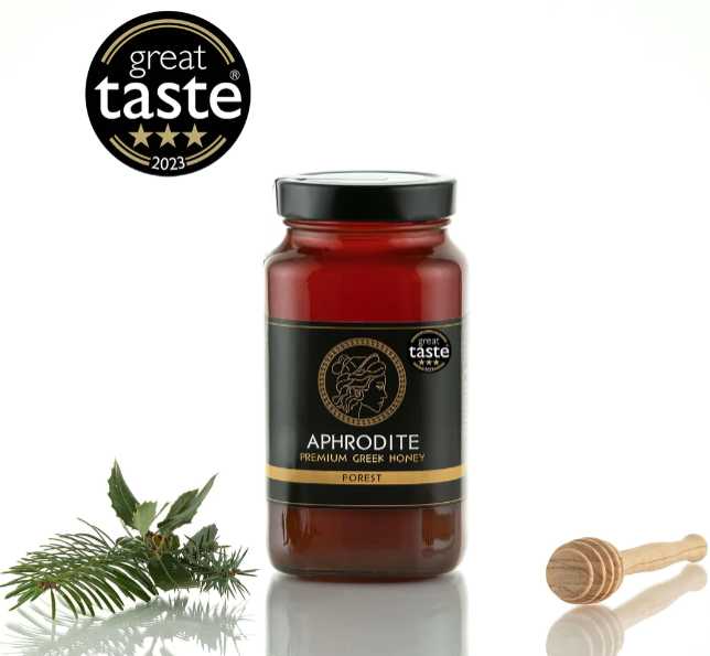Lesní med APHRODITE oceněný 3 hvězdami GREAT TASTE!.. je vzácná a jedinečná směs medovice pocházející z jedle, dubu a kaštanů a částečně také květový med této oblasti - sklízený z nedotčených vysokých oblastí pralesů Evritanie v nadmořských výškách 1200 až 1600 metrů! Každá sklenice nabízí vyváženou kombinaci chuti, která pochází ze stálezelených jehličnatých stromů hory Pindos.
