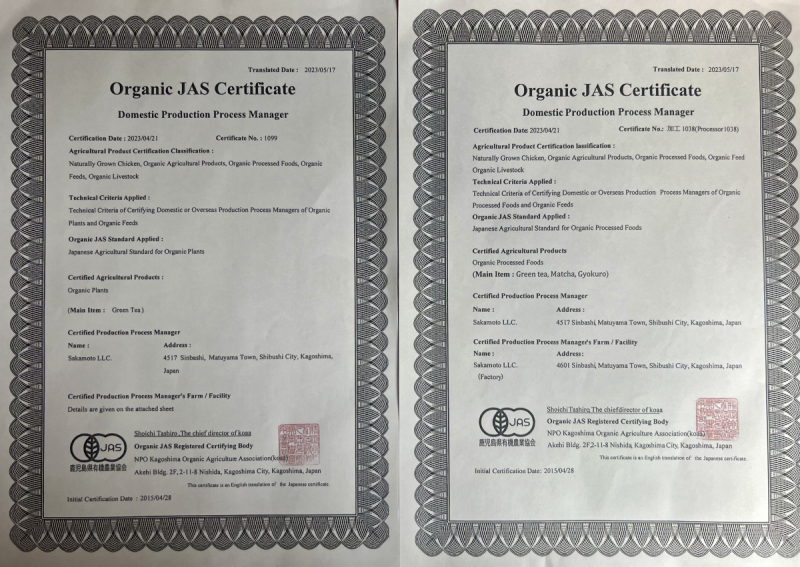 Certifikace: EU a JAS certifikovaná čajová farma od roku 1985