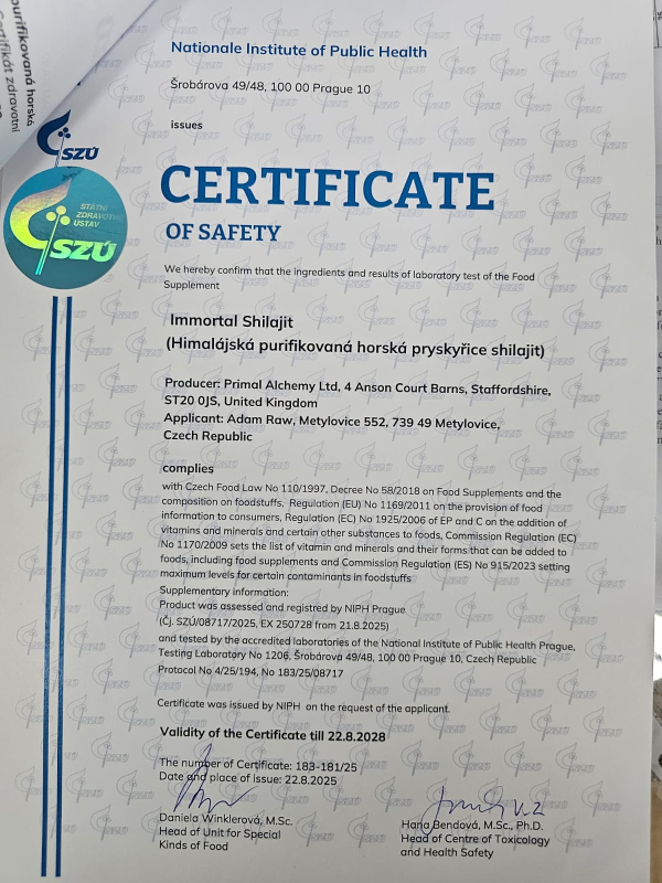 Navíc je immortal shilajit jediný shilajit na trhu této úrovně zlaté třídy z vysokých himálají, který jsme řešili přímo se státem. Máme od roku 2019 tolik analýz a testů na bezpečnost (+garantujeme nejlepší možné složení na trhu), že jsme vše poslali do státního zdravotního ústavu a obdrželi certifikát SZÚ.