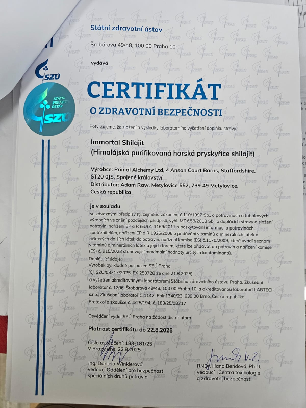 Navíc je immortal shilajit jediný shilajit na trhu této úrovně zlaté třídy z vysokých himálají, který je schválený přímo státem. Máme od roku 2019 tolik analýz a testů na bezpečnost (+garantujeme nejlepší možné složení na trhu), že jsme letos vše poslali do státního zdravotního ústavu i SZPI na hloubkovou kontrolu a obdrželi jsme samozřejmě certifikát SZÚ na bezpečnost i kvalitu.