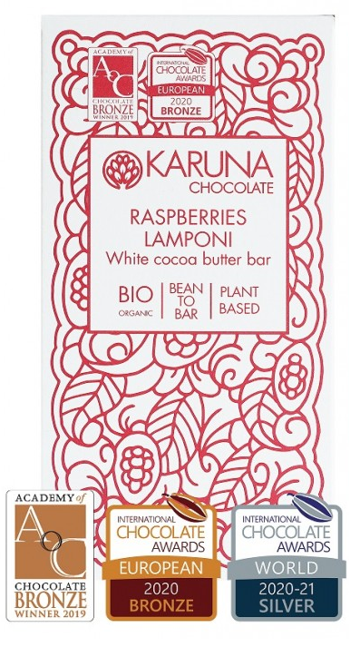 Řemeslný veganský výrobek z kakaového másla s mrazem sušenými malinami. Místo mléka obsahuje odtučněnou mandlovou mouku, takže bez obsahu nežádoucích tuků omega 6. Obsah mrazem sušených malin je obrovský - 11% hmotnosti. Kromě čokolády bílého a ovocného typu jde tedy hlavně o vitamínovou bombu. Oslazena je pouze organickým raw třtinovým cukrem, v množství 12,5g na celou tabulku (ekvivalent přírodního cukru v půlce většího jablka).