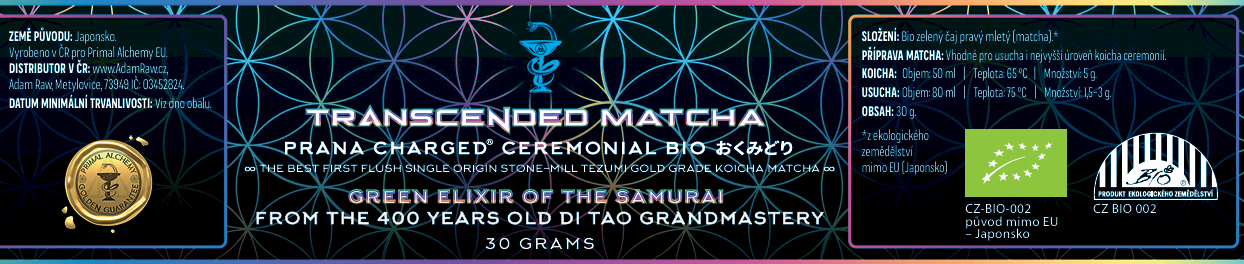 Tato matcha od Primal Alchemy® je pak vyvrcholením mého hledání té nejlepší matcha pro zejm. koicha přípravu a skutečně významné rituály/příležitosti - její umami a jemnost bez hořkosti je v organické kvalitě absolutně bez konkurence kdekoli v japonsku. Srovnáno i s nejlepší bio matcha výraběnou pro japonský císařský dvůr a desítkami nejlepších soutěžních matcha v cenách od 3-18! tisíc za 20-30g! na japonském trhu! Primal Alchemy Transcended matcha je zelený klenot, vyráběný v nanošarži pouhých pár desítek kusů jen 2x za rok! Lépe to aktuálně nejde. Přímý kontakt v japonsku na rodinu se 400 lety zkušeností a dovoz přes EU při oficiální BIO certifikaci a balení do fialového skla (více viz níže), tradiční Primal Alchemy Prana Charge® na 432 hz a výhradní distribuce pro Primal Alchemy se zlatou pečetí garance toho nejlepšího v dané kategorii!