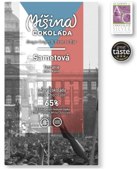 Tmavá čokoláda 65% z bio kakaových bobů z Tanzanie je ručně zdobena bílou čokoládou s českými šípky. Čokoládu se šípky jsme původně vymysleli k výročí listopadové revoluce. Měla velký úspěch nejenom u vás, ale i u porot prestižních světových soutěží. Sametová získala nejvyšší možné ocenění v prestižní světové gastro soutěži Great Taste Awards v Anglii. Je to první česká čokoláda, která v historii této soutěže získala 3 hvězdičky. Dále získala stříbrnou medaili v další mezinárodní soutěži Academy of Chocolate Awards v Londýně.