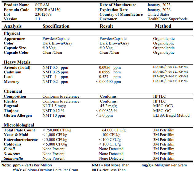 Bylinné extrakty použité v HealthForce SCRAM™ jsou nejvyšší kvality a čistoty - při extrakci se nepoužívají žádná rozpouštědla; pouze voda, CO2 nebo alkoholové extrakty. Jednotlivé extrakty jsou testovány na rozpouštědla a testy složek. 100% funkční ingredience. Bez plniv, tekutých činidel, zrn/škrobů nebo pomocných látek.
