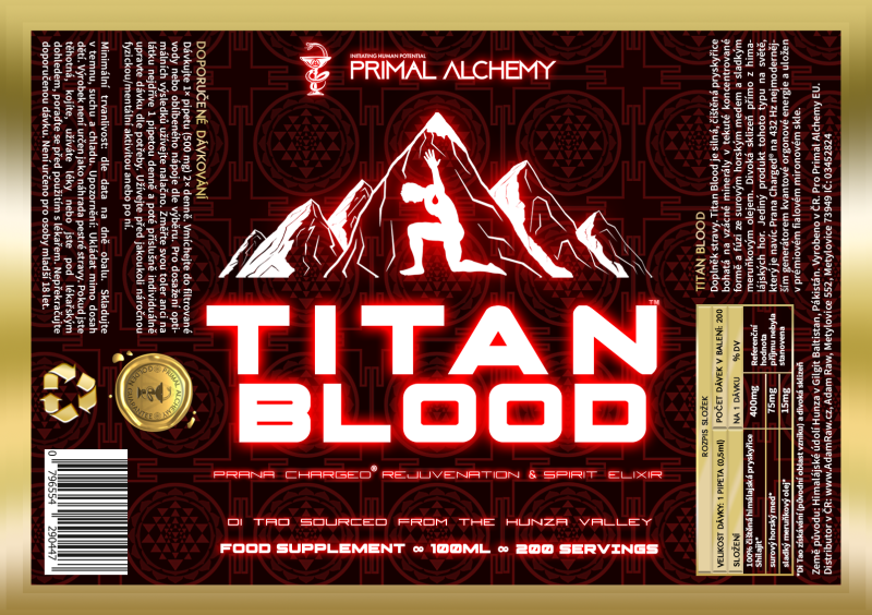 Titan Blood (Krev Titánů) je revitalizující a omlazující elixír ducha od Primal Alchemy. Všechny suroviny pocházejí z Di Tao získávání a jsou udržitelně divoce sklizené z posvátných himálajských hor v údolí Hunza (Gilgit Baltistan) o nichž se traduje védský mýtus, že skrývají starověké fosilizované pozůstatky titánů, kteří vládli zemi během posledního zlatého věku.