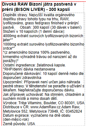 - Masivních 4000mg mrazem sušených bizoních jater a 1000mg mrazem sušeného bizoního srdce na denní dávku (10 kapslí)